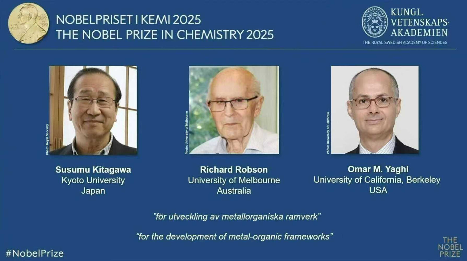 The Royal Swedish Academy of Sciences przyznała ją Susumu Kitagawie, Richardowi Robsonowi i Omarowi M. Yaghiemu „za rozwój struktur metaloorganicznych” — innymi słowy, za pionierskie prace nad MOF-ami.